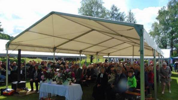 Kappel aneinandergereiht, die Bierbänke bis auf den letzten Platz besetzt. Junge und ältere Menschen feiern den Gottesdienst mit Dekanin Berthild Sachs und stimmen auch in deren Geburtstagsständchen zum 40. des Kunreuther Pfarrer Jochen Müller mit ein. Der eigentliche Geburtstag, der so festlich gefeiert wird, ist aber 30 Jahre Diakoniestation Gräfenberg. Die Dekanatsjugendband spielt und singt, der Posaunenchor jubelt.