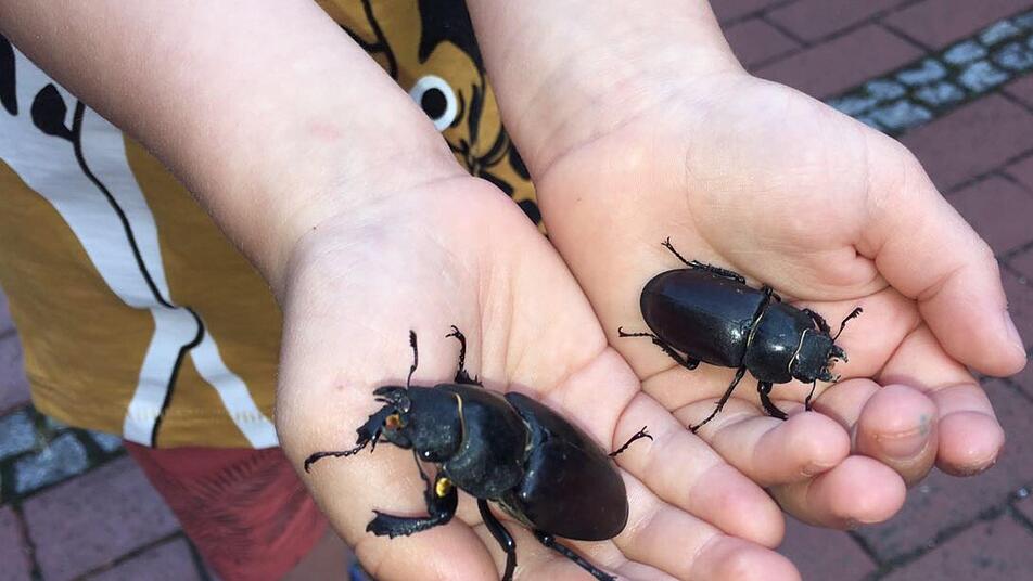 Auch diese beiden Käfer wurden vorsichtig an einen Holzstapel umgesiedelt. Von Berufs wegen und als Naturfreund kennt Burkard die Hirschkäfer. Und seine beiden Kinder wollten gleich alles über den außergewöhnlichen Fund wissen. "Die Begeisterung war natürlich groß", erzählt Burkard.