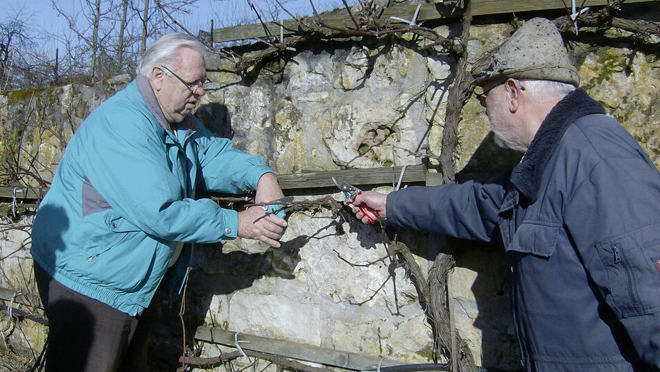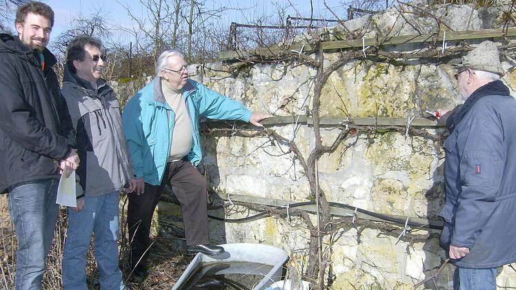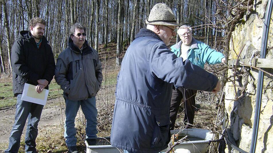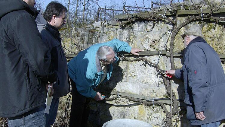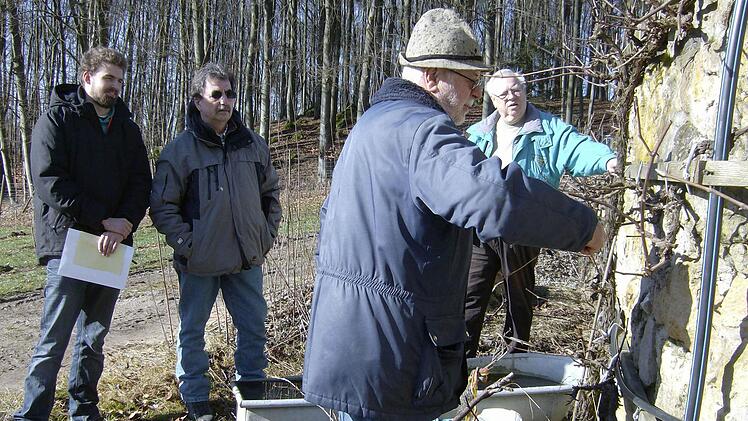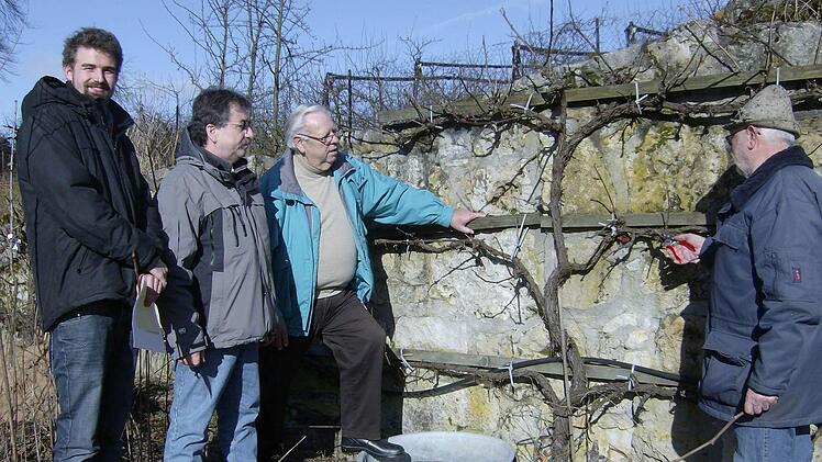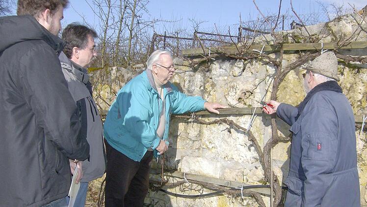 Von den schon kräftigen Sonnenstrahlen am Morgen in den Mittelpunkt gerückt, bildet das zu erziehende Objekt an den Hängen des Badersberg und des Kalbskopf zugleich eine idyllische Kulisse. Mit Heckenscheren bewaffnet, finden sich drei interessierte Herren aus dem Landkreis ein, um sich Tipps, für die eigenen Weinreben im heimischen Garten zu holen.