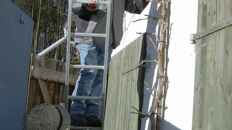 Der wichtige Schnitt findet auch schon im Sommer statt. Nach der letzten Traube wird auf zwei bis drei Blätter, manchmal auch mehr, zurückgeschnitten. Nur nicht zu kurz. "Das Blatt ist die Lebensader der Pflanze", merkt Vogel an und fordert einen der Teilnehmer auf, die Leiter hinaufzusteigen, um "Angela" richtig zu kürzen.