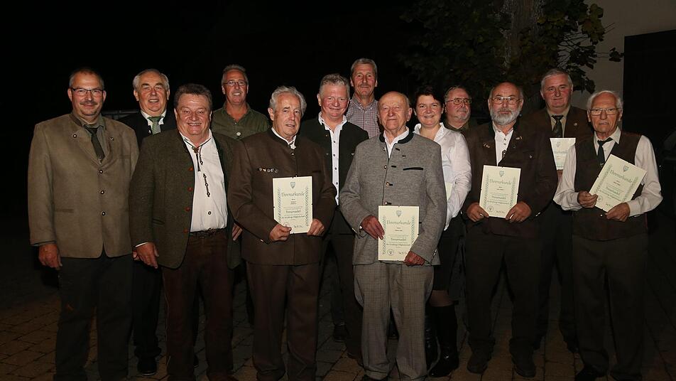 Zentral vor dem Altar aufgebaut war das Hubertus-Zeichen, zwei prächtige Geweihstangen mit einem Kreuz in der Mitte in Anlehnung an die Legende. Demnach stellte Hubertus vor seiner Bekehrung einem Hirsch nach, der nach langer Pirsch ohne Regung vor ihm stehen blieb. Als Hubertus zum Bogenschuss ansetzte, erblickte er plötzlich zwischen den Geweihstangen ein leuchtend goldenes Kreuz. Im Anschluss an die Hubertusmesse sollte die Gemütlichkeit bei der Hubertusfeier in der Gaststätte Prütting-Brendel nicht zu kurz kommen. Hans-Jürgen Dittmann nutzte zusammen mit seinem Stellvertretern Erich Fiedler, gleichzeitig Fachberater im Landkreis Forchheim, und Udo Burkard die Gelegenheit, treue Mitglieder für ihre langjährige Mitgliedschaft im Bayerischen Jagdverband zu ehren. Ausgezeichnet wurden für 25 Treue: Anton Eckert, Roland Hetzel, Reinhard Kupfer, Ute Kupfer, Günter Münch, Peter Neuner und Peter Wagner; 40 Jahre: Gerhard Kaul und Hans Polster; 50 Jahre: Willibald Ohlwärter, Anton Ringel und Johann Seitz. Für Seitz, Weidmann aus Thuisbrunn, war es ein besonderes Geschenk, feierte er doch an diesem Tag bei bester Gesundheit seinen 89. Geburtstag.