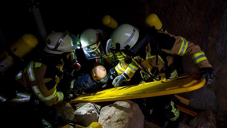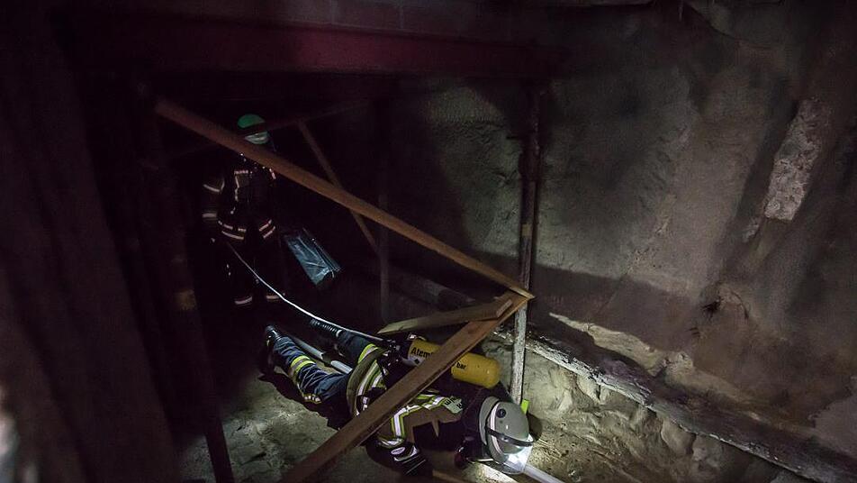 Die Alarmierung zum letzten Übungseinsatz für diesen Tag folgte um 22.16 Uhr: Nach einer heftigen Explosion am Kellerwald wurden mehrere Personen vermisst, aus einem Schacht waren Hilferufe zu hören. Bereits nach wenigen Minuten war der komplette Zug mit vier Fahrzeugen und 20 Aktiven vor Ort. Nach ausführlicher Erkundung und Befragung der angetroffenen Passanten stand fest, dass mehrere Personen in den weit verzweigten Kellergängen vermisst wurden. In einem Luftschacht des Kellers lag eine weitere verletzte Person, die es zu retten galt. Sofort ging ein erster Trupp unter Atemschutz mit Messgeräten in den Keller vor, um die Verletzten zu retten und sicherzustellen, dass für die Einsatzkräfte keine Gefahr durch weitere Explosionen oder einen Einsturz besteht. Weitere Kräfte beruhigten den im Schacht eingeschlossenen Verletzten, bis auch dieser schließlich, mit einer Leine gesichert, über eine tragbare Leiter gerettet wurde.