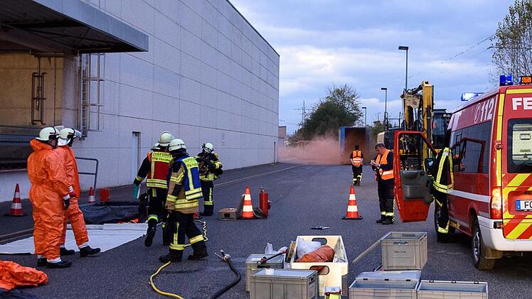 Sofort nach der Alarmierung gegen 17.45 Uhr rückte der Gefahrgutzug der Feuerwehr zum Einsatzort aus. Parallel zu einer ersten Erkundung der Lage durch einen mit Atemschutz ausgerüsteten Trupp und der Absperrung des Gefahrenbereichs wurde der Einsatz unter Chemikalienschutzanzügen vorbereitet. Nach circa 20 Minuten verschärfte sich die Lage erheblich, da eine Reaktion der geladenen Chemikalien zur Entwicklung hochgiftiger Dämpfe führte, die mit Hilfe von orangefarbenem Rauch eindrucksvoll dargestellt wurden. Neben dem Unterbinden einer weiteren Reaktion wurden Maßnahmen zum Schutz der Bevölkerung, unter anderem deren Evakuierung im näheren Umkreis und eine Sperrung der angrenzenden Bahnstrecke, getroffen. Anschließend musste der Stückgut-Transporter vollständig entladen werden, um weitere Reaktionen zu vermeiden. Gegen 19.15 Uhr wurde das zeit- und kräfteraubende Entladen des Fahrzeugs unter Chemikalienschutzanzügen aufgrund der weiteren Planungen abgebrochen, da alle wichtigen Entscheidungen und Maßnahmen bereits erfolgreich eingeleitet worden waren. Anschließend galt es, die Einsatzbereitschaft der sehr umfangreichen Ausrüstung für Gefahrguteinsätze wiederherzustellen.