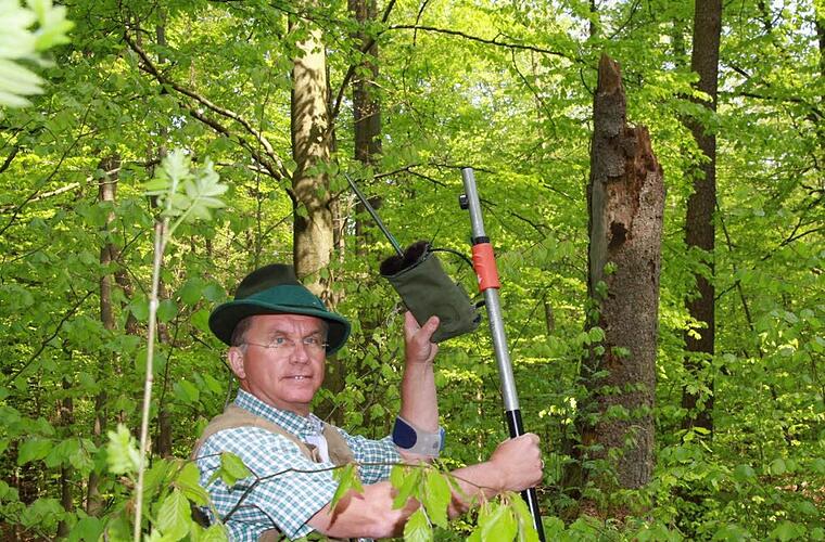 Die Bayerischen Staatsforsten arbeiten dabei eng mit der Unteren Naturschutzbehörde zusammen. Erich Daum stellt die Geräte am Abend an den vorher abgesprochenen Waldecken auf und sammelt sie dann am nächsten Morgen wieder ein. Drei Tage nacheinander wird die Prozedur wiederholt.