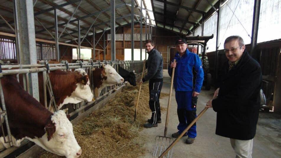 Ein weiteres Merkmal von Mehls Landwirtschaft ist, dass "der Betrieb durch die Familie geführt wird", erklärt Reinhard Friedrich. Er ist stellvertretende Kreisobmann. Er erklärt dies, während die Kuh mit dem gelben Nummernschild im Ohr von Landwirt Bernhard Mehl am Maul gekrault wird. Schon mit 14 Jahren, als sein Vater starb, wurde Bernhard Mehl Landwirt.