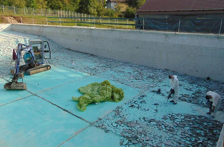 Seit Sommer laufen im Freibad die Abbrucharbeiten. Dabei wurden die Farbbeschichtungen an den Becken entfernt und in separaten Containern zur Entsorgung gelagert. Auch die Vergussmasse in den Bodenfugen wurde ausgebaut. Da es sich bei dem Material um Sondermüll handelt, musste es analysiert werden. Das Ergebnis war die erhöhte PCB-Belastung.