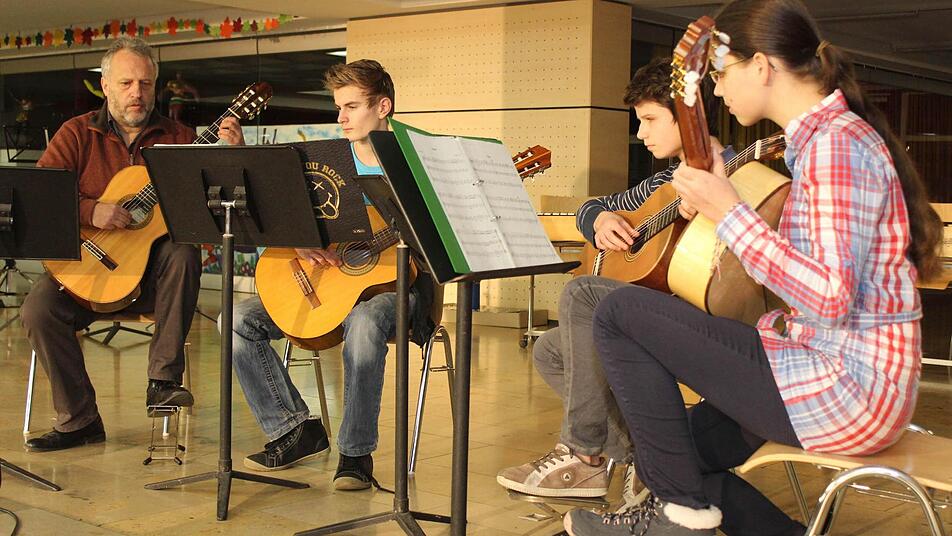 Für das Entrée sorgte das Kammerorchester unter der Leitung von Angela Leal-Rojas. Zu Gehör kam das Allegro aus dem Konzert in D-Dur von Antonio Vivaldi. Nach zwei Stücken der Orff-Gruppe des BRK-Heimes in Muggendorf, die damit den Lehrern der Musikschule Ebermannstadt für deren Unterstützung des Integrationsprojekts dankten, spielte das Gitarrenquartett mit Thomas Lipport das "Rondo tripla" von Tielmann Susato aus dem 16. Jahrhundert.