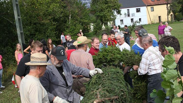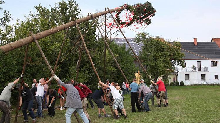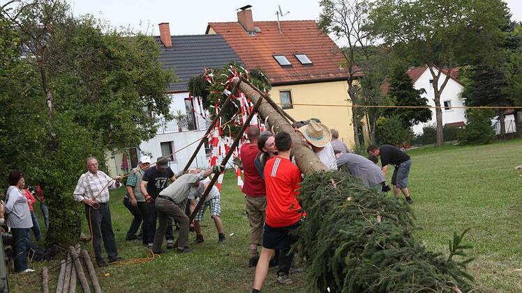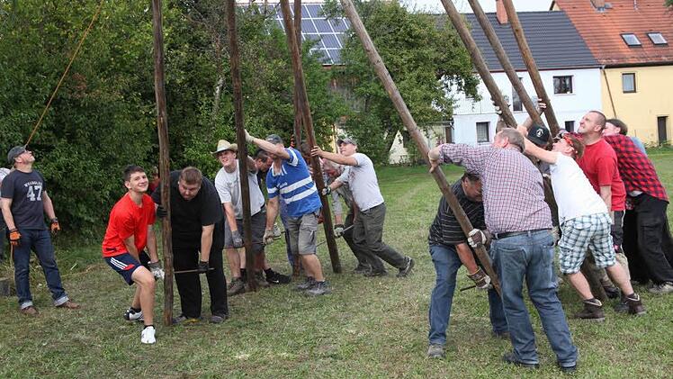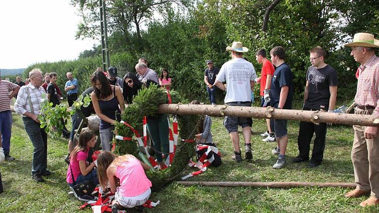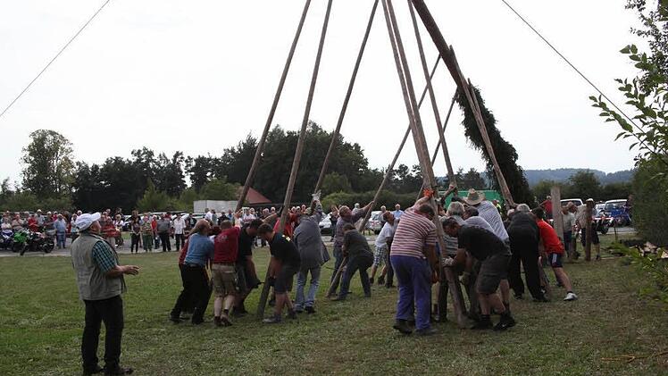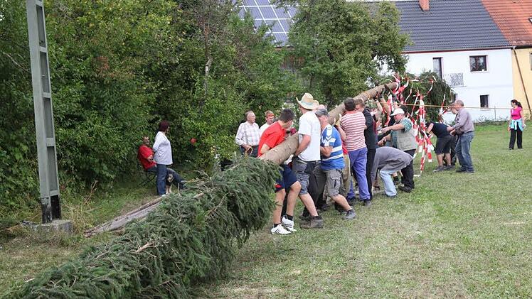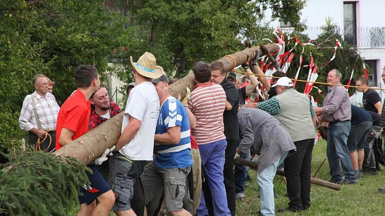 Zum Auftakt der fünftägigen Kirchweih in Heckenhof stellten die Kirchweihburschen aus dem Ortsteil von Aufseß mit dem Bumbara-Stammtisch am Samstagnachmittag einen 24,10 Meter langen Kirchweihbaum am Festzelt der "Kathi-Bräu" auf.