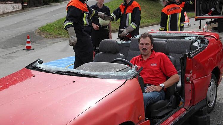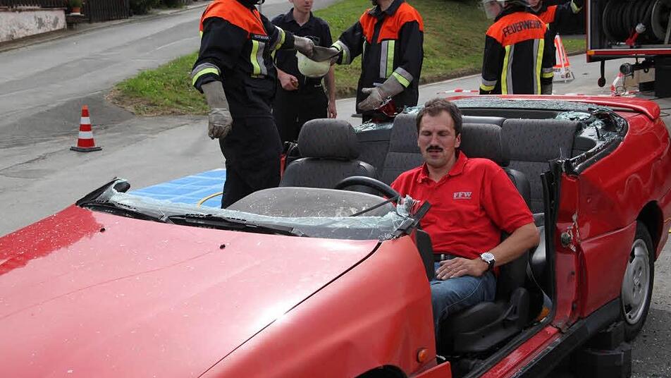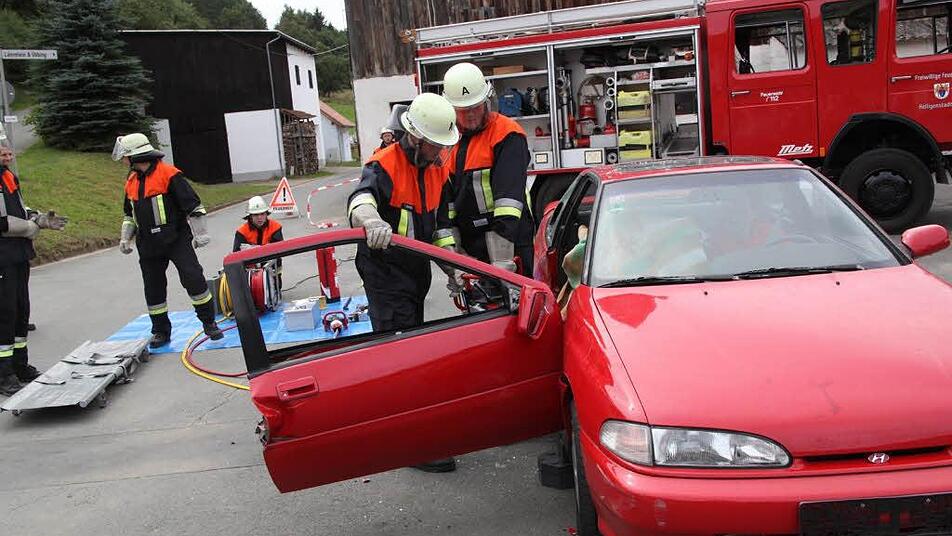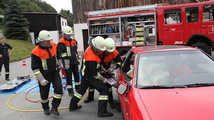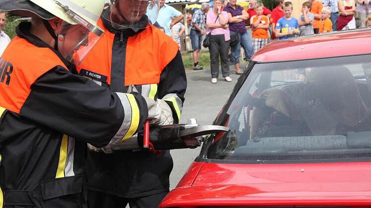 Die Feuerwehrler demonstrierten, wie sie ein Auto zerschneiden und darin eingeklemmte Menschen befreien.