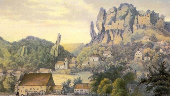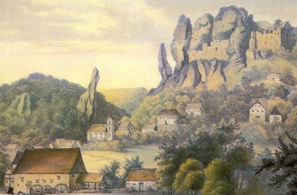 Am Ostersonntag 1798, es war ein 3. April, ging Jean Paul mit seinem Diener Florian Stuß auf Wanderschaft, vermutlich weil er sich mit Hermine gestritten hatte. Sie war eifersüchtig auf seine Verehrerinnen, weshalb er ihr einige Briefe zu lesen gab, die sie aber noch mehr erzürnten.  Über Berneck und Bayreuth kam er auf alten Postkutschenwegen in das Muggendorfer Gebürg und näherte sich seinem Tagesziel. Er schreibt darüber: "Es war gegen Abend, der Tag mit seinen Quellen des Scheines in Wassern und auf den Auen versiegte allmählich - das Sonnenlicht rückte von den Gipfeln auf die Bergspitzen und ergoss sich schon halb in den blosen durchsichtigen Himmel hinein.