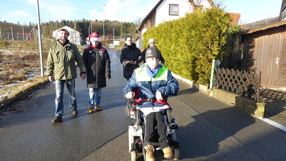 Max und Bahadir gehen an der Hand von Alex und Steffi, Marco fährt im Rollstuhl voraus. Es geht von Haus zu Haus, Max und Bahadir stecken die Mitteilungsblätter in die Briefkästen in der Sportplatzstraße. Gewissenhaft machen sie es.