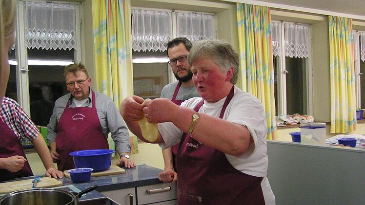 Zuerst mussten sich die Männer ihre Hände waschen und die roten Vereinsschürzen umbinden. Dann war Fingerspitzengefühl angesagt. Es war fast nicht zu glauben: Es war bewundernswert, wie geschickt sie sich alle anstellten und in einer lockeren Atmosphäre beispielhaft zusammenarbeiteten. Ein kleiner Teigballen nach dem anderen wurde abgestochen, auf dem bemehlten Brett abgedreht und auf ein Tuch gelegt. "Die sehen aus wie im Katalog", sagte Rudolf Pfeufer vergnügt. Freilich war das für die Männer eine ungewohnte Tätigkeit. Doch auch die "Marga" war überrascht darüber, wie gewandt und mit welcher Geschäftigkeit gearbeitet wurde.