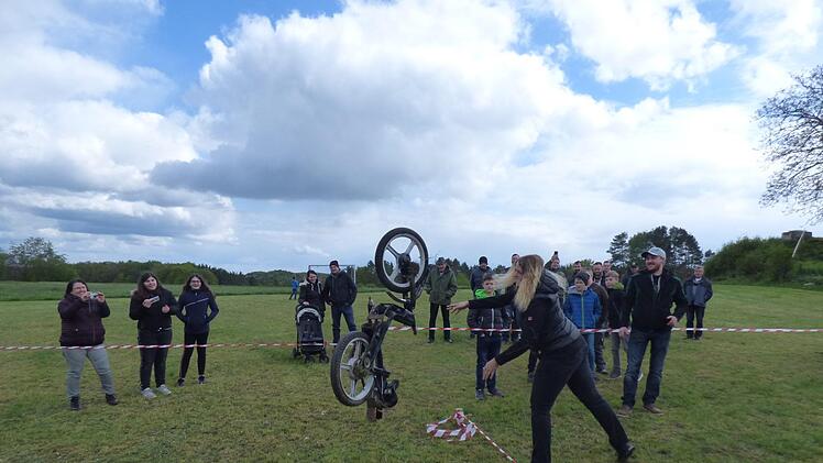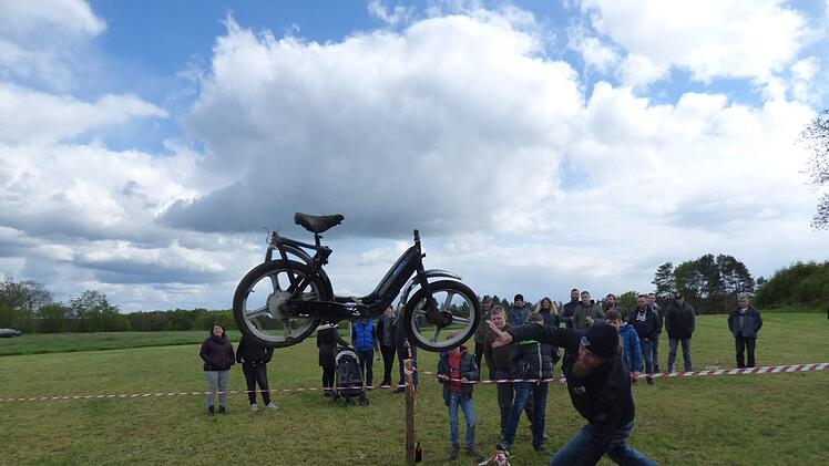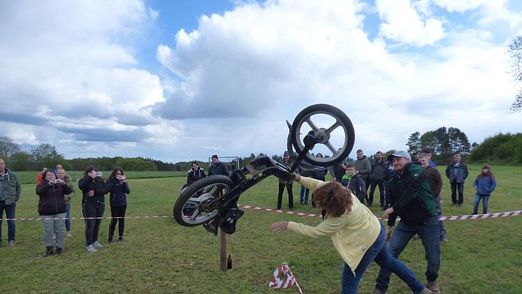 Drei Frauen ließen das dann schon recht lädierte Mofa durch den wolkenverhangenen Gösseldorfer Himmel fliegen. Regina Eger aus Ebermannstadt schaffte hervorragende 4,37 Meter. Carmen Richter aus Kalteneggolsfeld belegt mit 3,52 Metern Platz zwei und die Waischenfelder Stadträtin Hedwig Schrüfer schaffte es immerhin, das Mofa 2,21 Meter weit zu werfen.