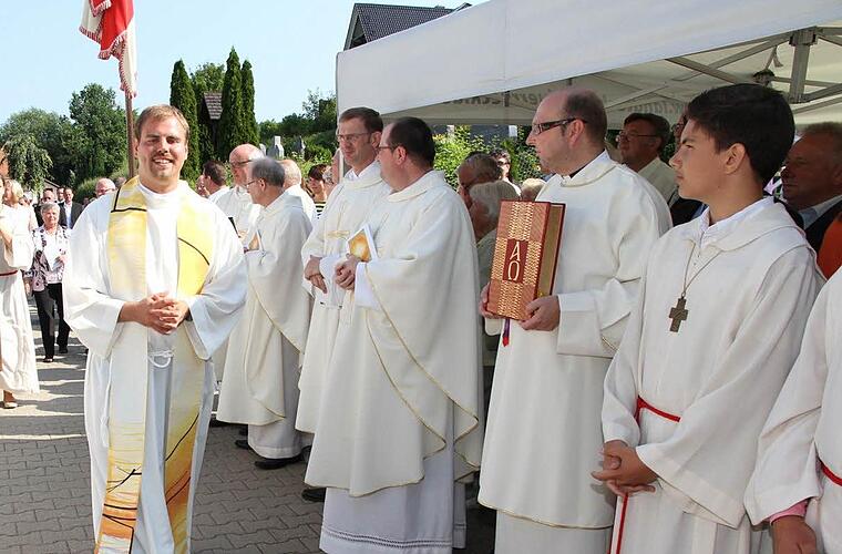 In einer Prozession mit Fahnenabordnungen der Gemeinde und der Blaskapelle Frank haben die Gläubigen den jungen Priester vor seinem Elternhaus abgeholt. 13 Priester und zwei Diakone begleiteten den Zug. Vor der Kirche empfingen johannes Saffer die Kindergartenkinder mit einem Lied und überreichten ihm Blumen.