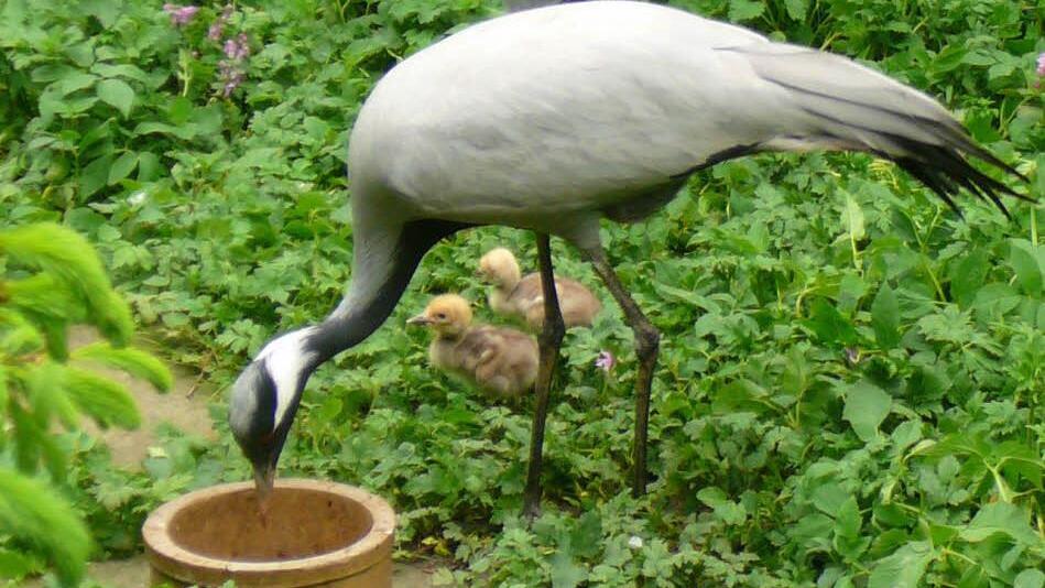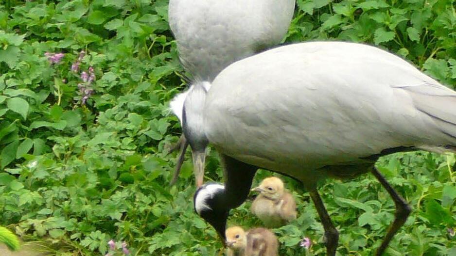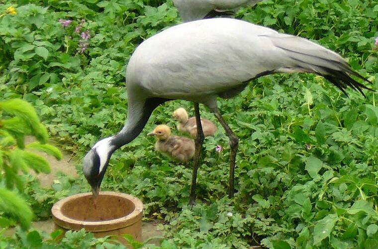 Warnung heißt der tiefe Laut, den die Kranicheltern in Richtung Tür des Schutzraums ausstoßen. Die beiden Jungfernkraniche haben längst bemerkt, dass Alfons Trautner nicht alleine ist, als er eine Schale, gefüllt mit Mehlwürmern an die Treppe vor dem gemauerten Schutzhaus stellt. Zwischen dem hohen grünen Gras, in dem die Eltern nach Insekten suchen, tauchen immer wieder kleine gelb-braune flauschige Köpfchen unbekümmert auf. Die beiden Jungvögel trappeln ihren Eltern im hohen Grün hinterher.