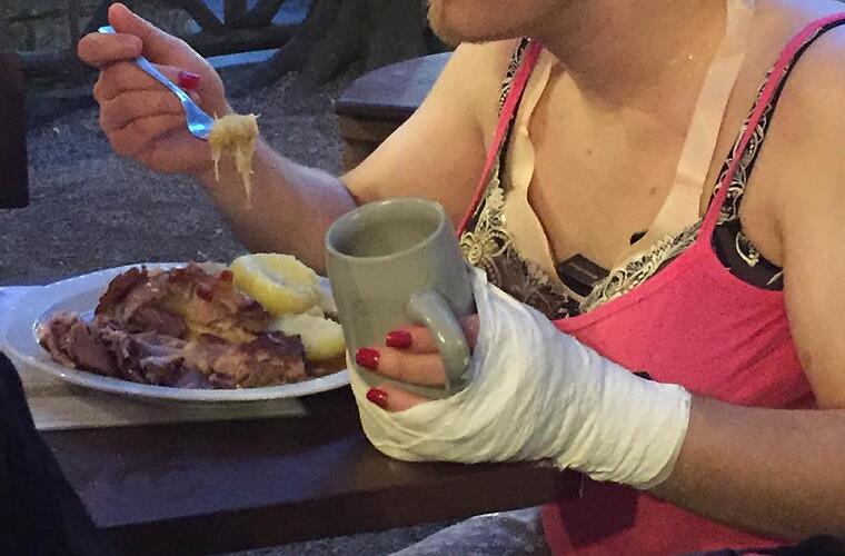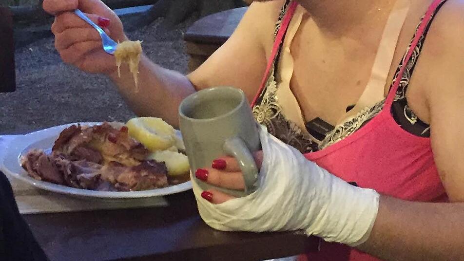 Nicht nur, weil der Drangsalierte im Outfit einer Dirne vom Rest der Truppe zum Anschaffen animiert wurde und so anderen Gästen allerlei unnütze Mitbringsel andrehen sollte. Nein, die sechs "Freunde", die passenderweise T-Shirts mit dem Aufdruck "Zuhälter" trugen, gipsten ihm zuvor noch heimtückisch einen steinernen Seidlaskrug an die Hand, so dass er noch unbeholfener war. Zumindest wurde ihm das Schäufala samt Klös kleingeschnitten, so dass er seinen Hunger wenigstens einhändig stillen konnte.