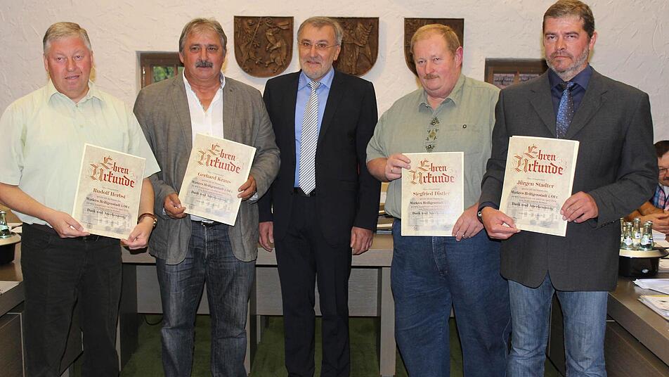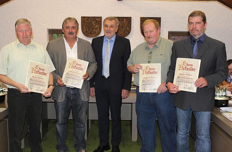 Verabschiedung bisheriger Ortssprecher Nachdem Bürgermeister Krämer die ausscheidenden Ortssprecher Gerhard Kraus aus Lindach (1990-2014), Siegfried Distler aus Siegritz (2002-2014) und Jürgen Stadter aus Tiefenpölz (2002-2014) sowie Rudolf Herbst aus Hohenpölz (2013-2014) mit Dank, Anerkennung und Respekt aus ihrem Ehrenamt verabschiedet hatte, führte er mit Thomas Hänchen (Neudorf), Christian Hümmer (Tiefenpölz), Andreas Dorscht (Stücht), Frank Pennig (Siegritz) und Mario Kraus die neu gewählten Ortssprecher in ihr Ehrenamt ein und ließ sie gleich noch die entsprechenden Verpflichtungserklärung unterzeichnen.