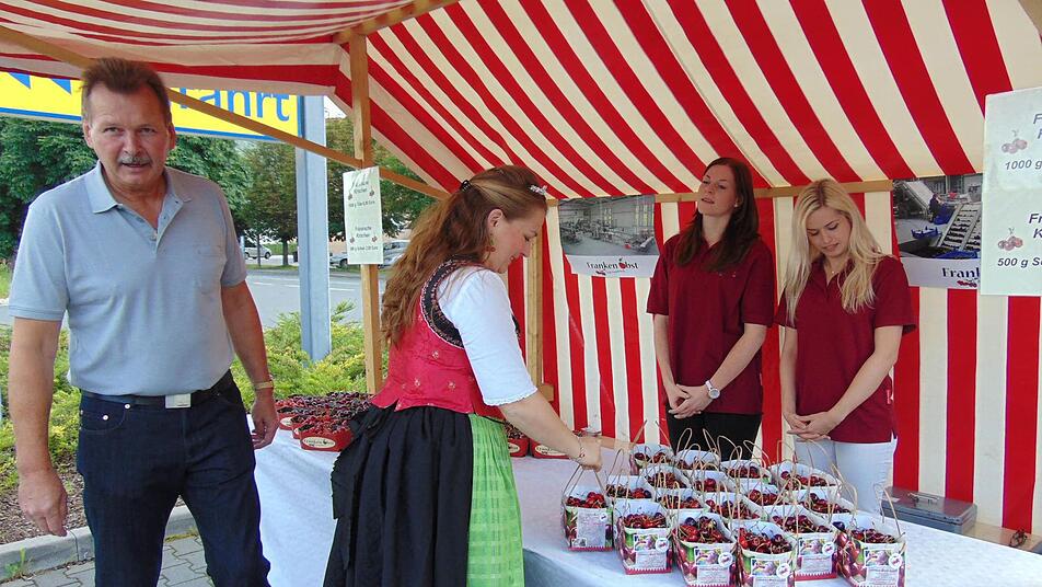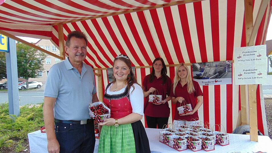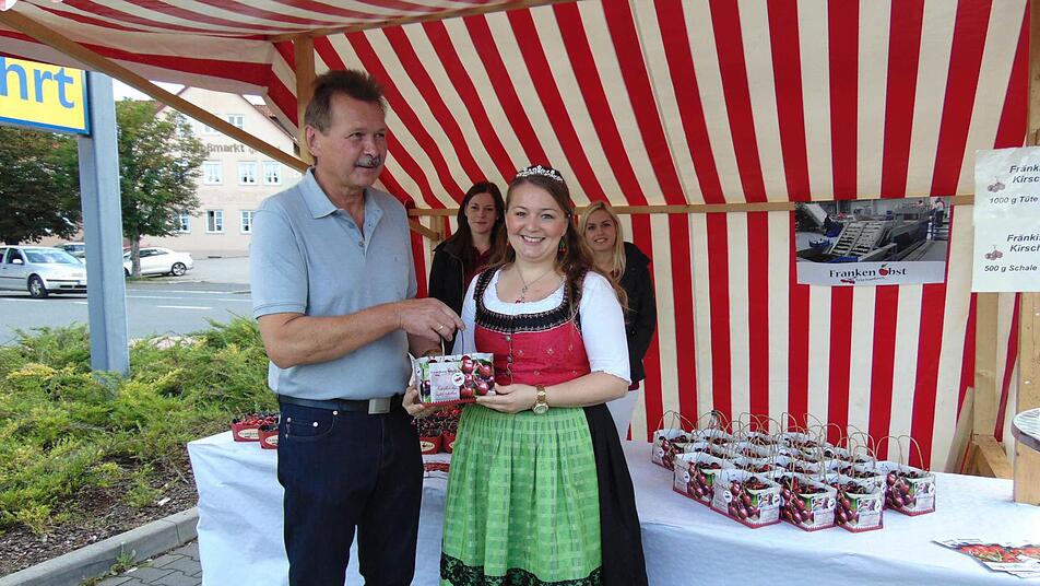 "Warum sind sie unterschiedlich rot?", will ein Besucher wissen. Das Franken Obst Team kann die Frage genau beantworten: "Es sind unterschiedliche Sorten." Auch Kirschkönigin Marina I nickt.