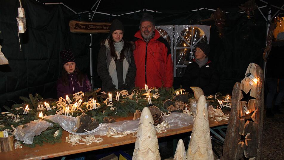 Doris Hochbeck bot Tee, Gewürze und Gestecke feil, Helmut Dietsch aus Wolkenstein verkaufte Holzfiguren, die er mit der Kettensäge erstellt hatte, und Simone Kraft aus Wannbach bot ihre Mützen zum Verkauf. Und solche konnten die Gäste gebrauchen, denn die Landschaft war vom Schnee gezuckert und es ging ein kalter Wind. Doch allen war warm, denn die Lützelsdorfer hatten selbst gebaute Heiztonnen aufgestellt. Später am Abend sorgte der Posaunenchor aus Wannbach noch für festliche Stimmung.