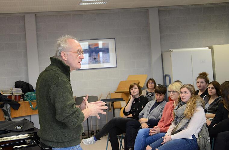 Die Sinneswahrnehmung des Hörens von Tönen sei die einzige Freiheit, die geblieben sei, denn sie biete Ruhe vor Sprache und Wort, erläutert Ospald den Schülern des Musikkurses der Oberstufe. Im Rahmen des Projekts "Komponisten gehen in die Schule" besucht Klaus Ospald das Herder-Gymnasium Forchheim und erzählt vom Beruf des Komponisten, seinem Werdegang und stellt seine Werke vor.