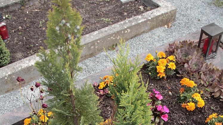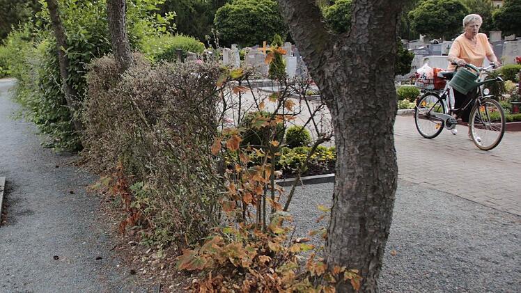 Für die Floristin Elisabeth Kraus, die gerade zwei Thujen mit einem Stammdurchmesser von mehr als 20 Zentimetern von einem Grab entfernt hat, weil sie verdorrt waren, ist die Sache völlig klar: Schuld sei der Splitt, der zwischen den Gräbern verteilt wurde. Die Steinchen seien mit Streusalz versetzt, das den Pflanzen den Garaus gemacht hat. Der Schaden: "Ein paar hundert Euro", urteilt Kraus.