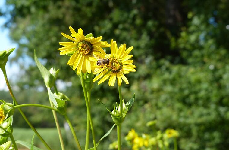 Aber - und das ganz besonders in trockenen Sommern - es blüht fast nichts mehr. Nach der Heuernte sind heuer die Wiesen eher vertrocknet, als dass Gras und Blütenpflanzen fürs Grummet (zweiter Schnitt) aufgekommen wären. Die Silphie kann sich gegen Trockenheit schützen. Ihre Blätter sind becherförmig um den Stängel angelegt, so dass sich dort Regen und Tau sammeln.