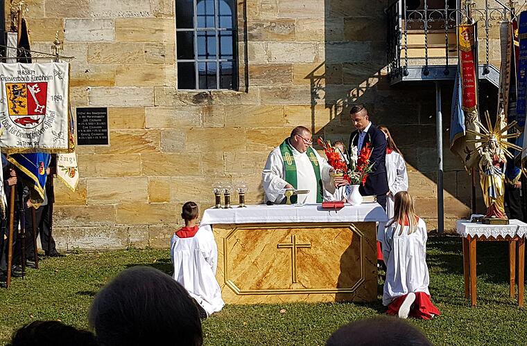 Kreisvorsitzender Roland Schäfer bedankt sich im Kreis der Fahnenabordnungen bei Pfarrer Gehret und den freiwilligen Helfern. Foto: Reinhard Spörl