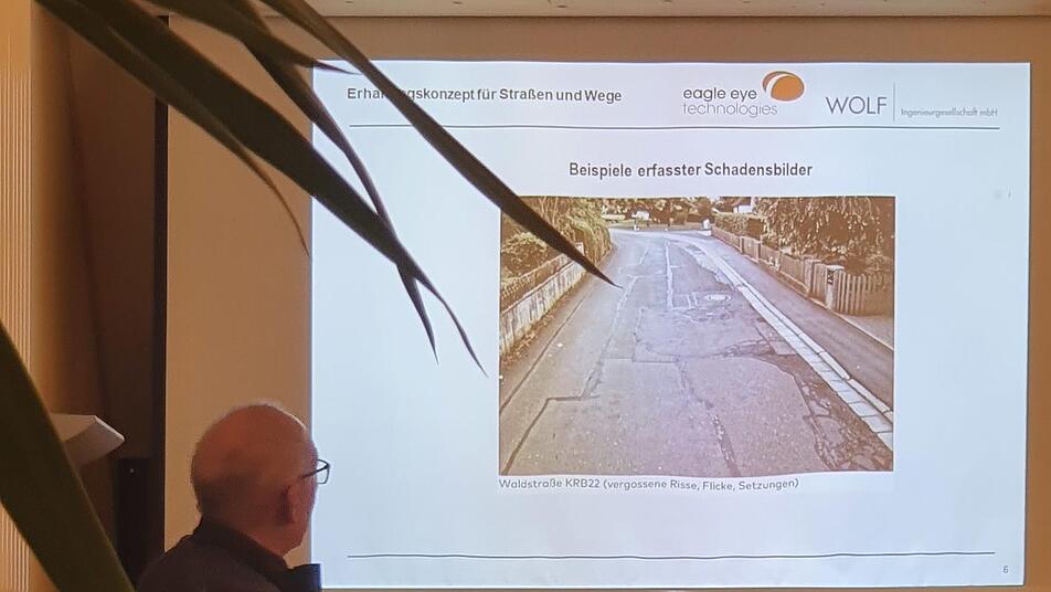 Peter Bittel zeigte drei Szenarien für ein mögliches Handeln in den nächsten zehn Jahren auf: Man könne nichts tun, dann würden noch mehr Straßen in einen kritischen Zustand geraten. Oder es stehe ein unbegrenztes Budget zur Verfügung, dann müssten etwa 4,1 Millionen Euro, davon gleich im ersten Jahr 1,9 Millionen Euro, investiert werden. Oder die Gemeinde investiert jährlich 200.000 Euro. "Das reicht aber nicht. Sie müssten mindestens 300.000 Euro in die Hand nehmen", sagte Peter Bittel. Siegfried Adami (SPD) wollte wissen, ob man die Gemeinde mit dem geringen Oberbau "beschissen" haben könnte. Hier meinte Bittel, dass das vom Alter der Straße abhängig sei. Konrad Galster (FW) ließ sich vom Referenten erklären, dass weitere Untersuchungen am Unterbau der Straßen für eine Maßnahmenplanung nötig sind. Rainer Gebhardt (SPD) wollte wissen, wie sinnvoll die Sanierung der Risse ist. "Es ist besser als nichts zu tun", antwortete Bittel und erklärte, dass durch die Klimaverhältnisse aus Rissen Schlaglöcher werden können.