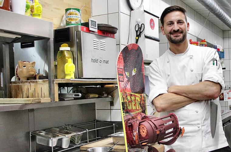 Das Snowboard parkt neben den Gewürzen. Die Boxen stehen gleich daneben über den Töpfen. "Ein bisschen Rock beim Mis en place geht schon", sagt der Florian und dreht den Sound noch etwas auf. Jetzt macht es sich der 32-Jährige in seinem Reich gemütlich. Legt sein japanisches Messer mit der superscharfen Klinge auf das Hackbrett. Holt frischen Thymian, Meersalz und Pfeffer. Schlägt süße Sahne steif und würfelt nebenbei das Sellerie-Gemüse. Wählt geeignete Pfannen und Töpfe aus, bevor er zum Kühlhaus schlendert.