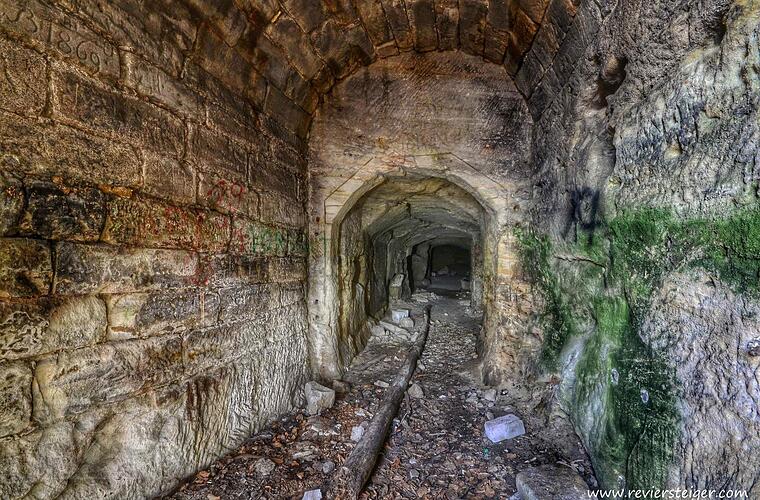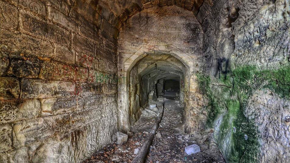 Eher unscheinbar wirkt der Felsenkeller in der Landschaft. Die gemauerte Lüftungskammer ist zu sehen. Der Bau - ein schönes Sandsteingewölbe - hat eine Gesamtlänge von etwa 350 Metern. "Die Hallen wurden erweitert und sind sieben bis zehn Meter breit", sagt "Reviersteiger". Der Mann aus Hallerndorf beschäftigt sich seit 40 Jahren mit Altbergbau und war in so manchem Felsenkeller unterwegs. Seinen bürgerlichen Namen will er nicht in der Zeitung lesen.
