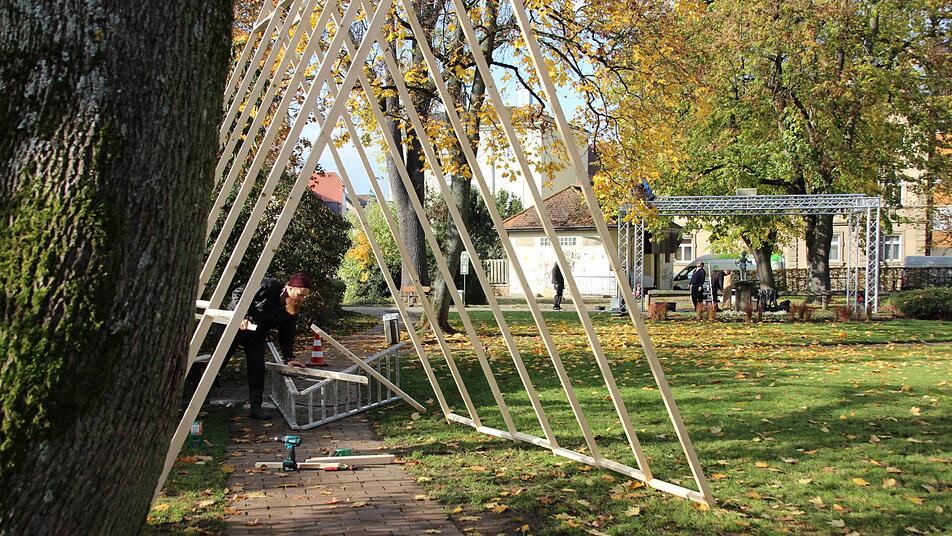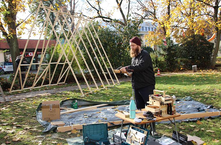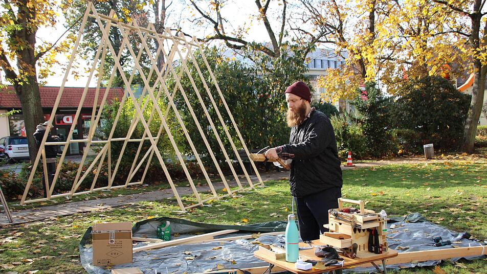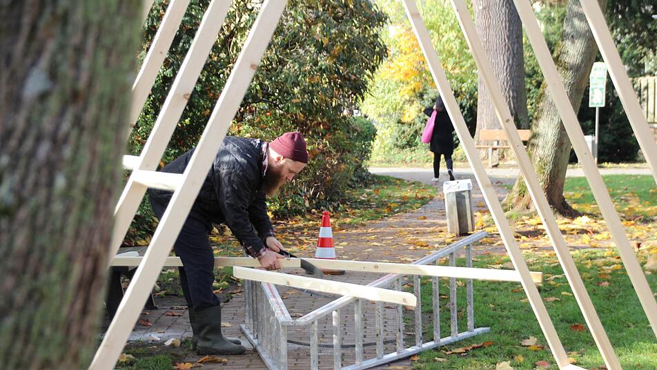 Künstler Robert Enderwitz schraubt unweit ein Gerüst aus Holzlatten zusammen, das Lichtschläuche tragen soll. Das Objekt führt - leicht versetzt - direkt über den Weg "Man kann es nicht ignorieren. Jeder, der durch den Park läuft, muss sich damit auseinandersetzen."
