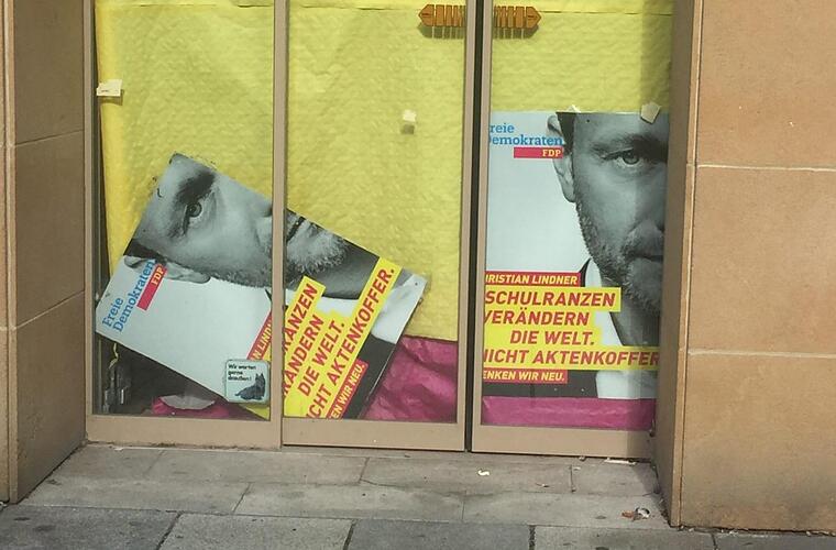 Ob dieser Versuch gelungen ist, bezweifelt Rainer F. aus Forchheim, der uns auf die Szenerie aufmerksam machte: "Erst dachte ich, da haben sich Kinder ein bisschen ausgetobt. Vielleicht ist es aber auch ein Wink mit dem Zaunpfahl, wenn jetzt schon die ersten Politiker im Schaufenster abstürzen."