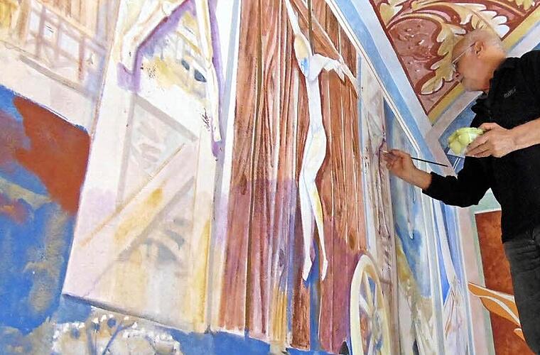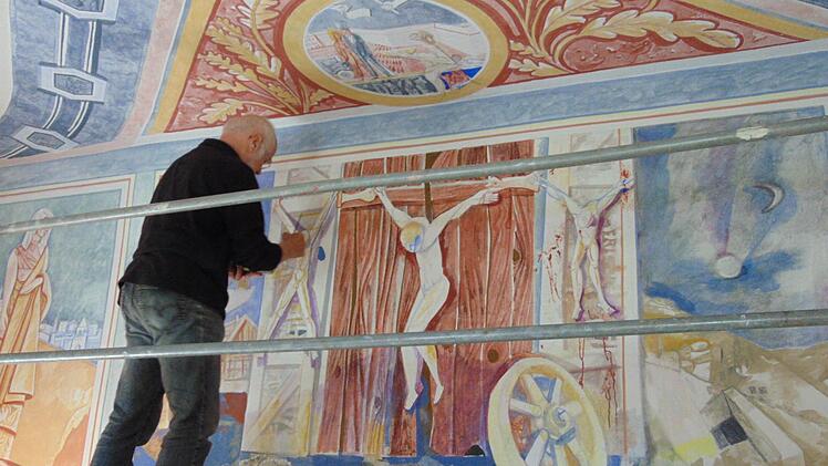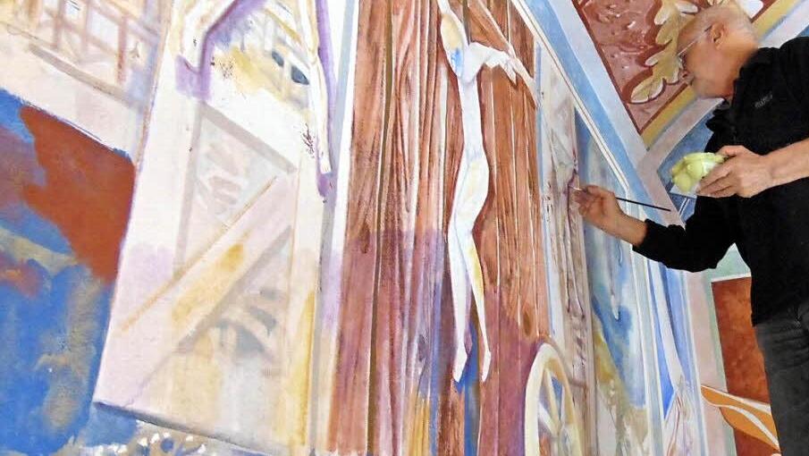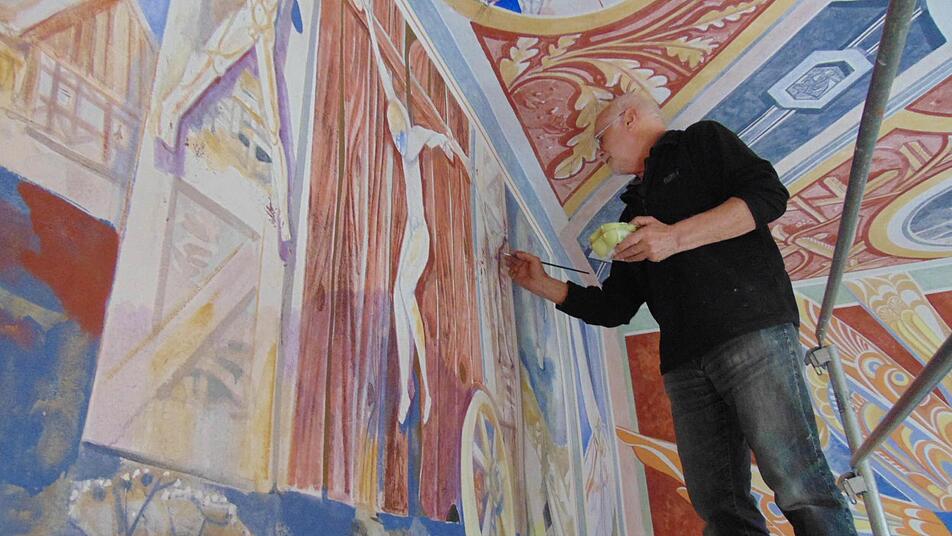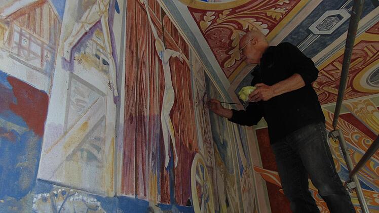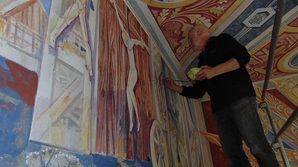 Erich Müller, der Schüler des berühmten Malers Wendelin Kusche, restauriert die Lillinger Kapelle, deren Wände Kusche einst selbst bemalt hat.