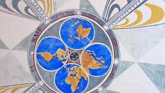 Oben auf der Decke sind die Erdteile dargestellt. In den grau-blauen Bändern an der Decke sind die Porträts der zwölf Apostel gemalt. Dann wird an den Wänden die westliche Welt aufgezeigt, der Reichtum als Mann und Frau mit Hut und Auto, darunter die Armut in Form eines nackten Bettlers.