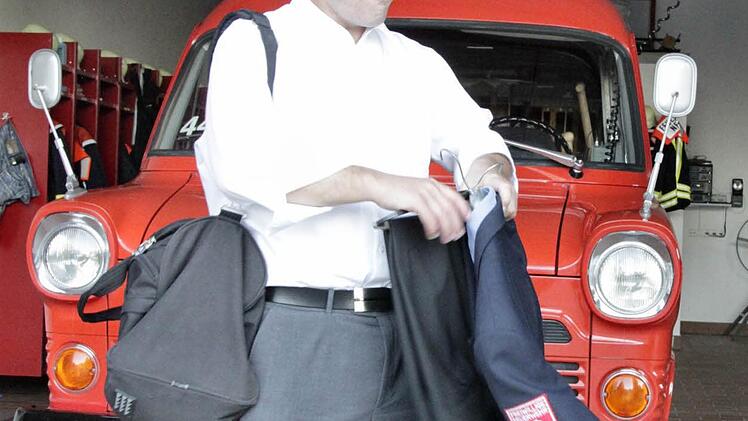 Darauf trinkt Hofmann erstmal einen kräftigen Schluck aus dem Maßkrug. Zum Essen fehlt die Zeit. Die Freunde von der Feuerwehr warten. Hofmann verwandelt sich genauso schnell vom Politiker zum Feuerwehrmann, wie vom Anwalt zum Kandidaten. Während die Kumpels mit den Schläuchen warten, rückt Hofmann noch schnell den Helm zurecht. Dann ist auch diese Verwandlung perfekt.
