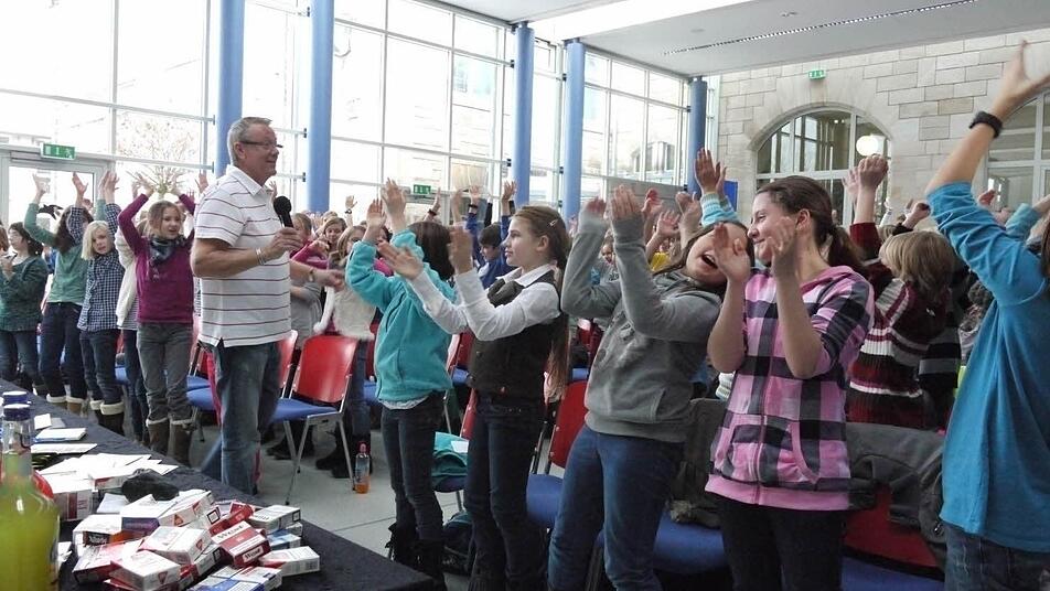 Lebhaft klatschen die Fünftklässer in der Aula des Herder-Gymnasiums eine flotte Melodie mit. In ihrer Mitte agiert ein älterer Mann: Dieter Breivogel aus Kulmbach. 30 Jahre war er Hausmeister in einer Schule, wie er später erzählt. "Und da kannte ich die Probleme aller Kinder", sagt er und kündigt das traurige Lied von "Wolke" an. So nennt er einen dieser Schüler, der nach einer Drogenkarriere im Alter von 23 Jahren von einem Hochhaus sprang. Ein Schicksal, vor dem Breivogel seit 2005 junge Menschen bewahren möchte.