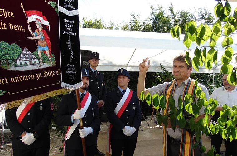 Beim Kirchenzug am Marktfest könne die Fahne zum Einsatz kommen, meinte Rast in einer kleinen Vorschau. Die Standartenträger hielten derweil ihre Fahne aufrecht, so dass alle Gäste einen Blick auf das blaue und weinrote Schmuckstück werfen konnten. Der heilige Florian ist abgebildet. Er hält schützend die Hand über das Gasthaus "Drei Linden". Das Gasthaus stehe stellvertretend für alle Häuser, sagte Pfarrer Andreas Hornung. Mehr noch: "Die Standarte ist ein Zeichen für die Solidarität, gegen der Tendenz, nur auf sich zu schauen", meinte der katholische Pfarrer. Die Feuerwehrleute hätten die anderen Menschen im Blick und deren Spruch auf der Fahne - "Ehre dem, der anderen zu Hilfe eilt" - sei ganz im Geist des Heiligen Florian und Jesu.