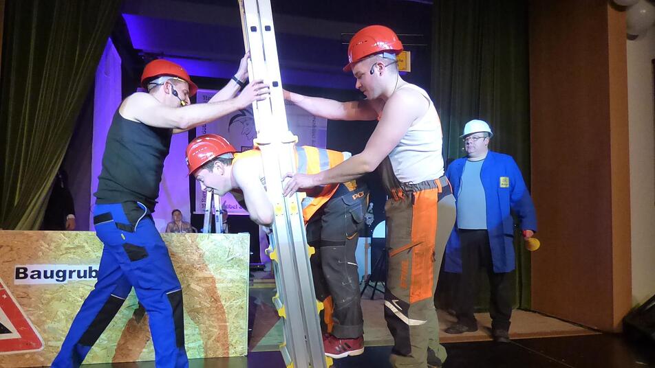 Alle weiteren Sketche stammten aus der Feder von Ehrenpräsident Franz Macht. Zum "Tag des Zugpferds" konnten Pottensteiner Bürger ihre Leuchtturmprojekte Bürgermeister Frühbeißer (Stefan Dresel) vorstellen. CSU-Chefin Birgit Haberberger ( Silvia Berner) forderte das schnelle Internet und einen Verkehrskreisel zur Verkehrsberuhigung von Rackersberg. Birgit Haberberger, die übrigens seit vielen Jahren Elferrätin des Narrenkübels ist, nahm's humorvoll. Weitere Leuchtturmprojekte sind der geplante Cafégarten von Bäckermeister Johannes Frosch (Mathias Stenglein), die Norma-Erweiterung vom Schöpf (Michael Stenglein), das inzwischen in Betzenstein errichtete Gesundheitszentrum von Dr. Stefan Bauernschmitt (Holger Kade) und der Weihnachtsladen von Manfred Rother (Dominik Lang). Die Norma-Erweiterung könnte allerdings noch ein schwanzloser flohkrebsiger Eselschwänzer verhindern, der im Haselbrunnbach entdeckt wurde. Ein weiterer Macht-Sketch hieß "Die Erlebnismeile" In Anlehnung an die legendären Stadtratswettkämpfe bei der weniger legendären Pottensteiner Kerwa mussten dabei zwei Stadtratteams anlässlich der Einweihung der neuen Erlebnismeile im Rahmen eines Bayern-3-Dorffests einen Wettkampf austragen. Vizebürgermeister Rainer Brendel wurde dabei mit Schnupftabaksdose von