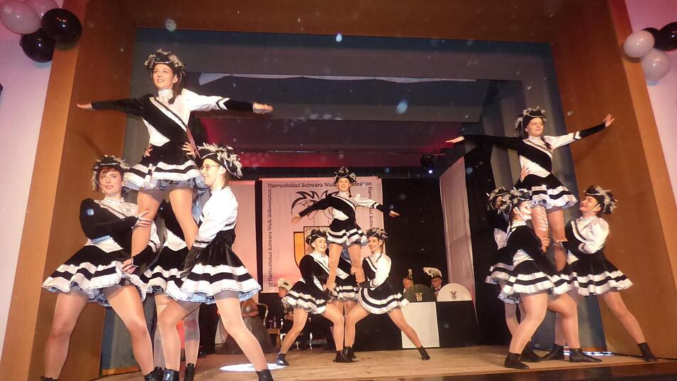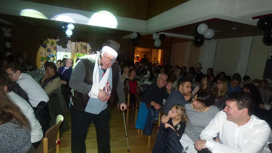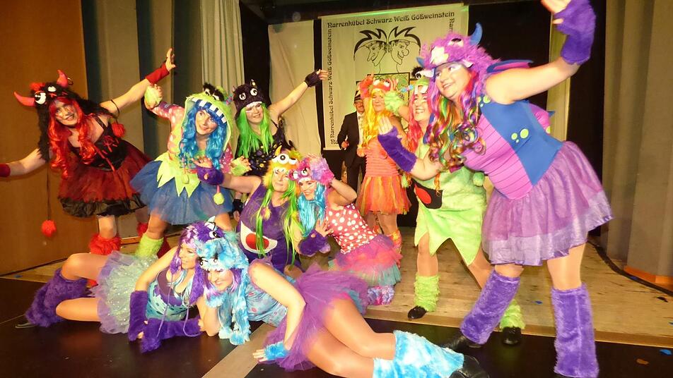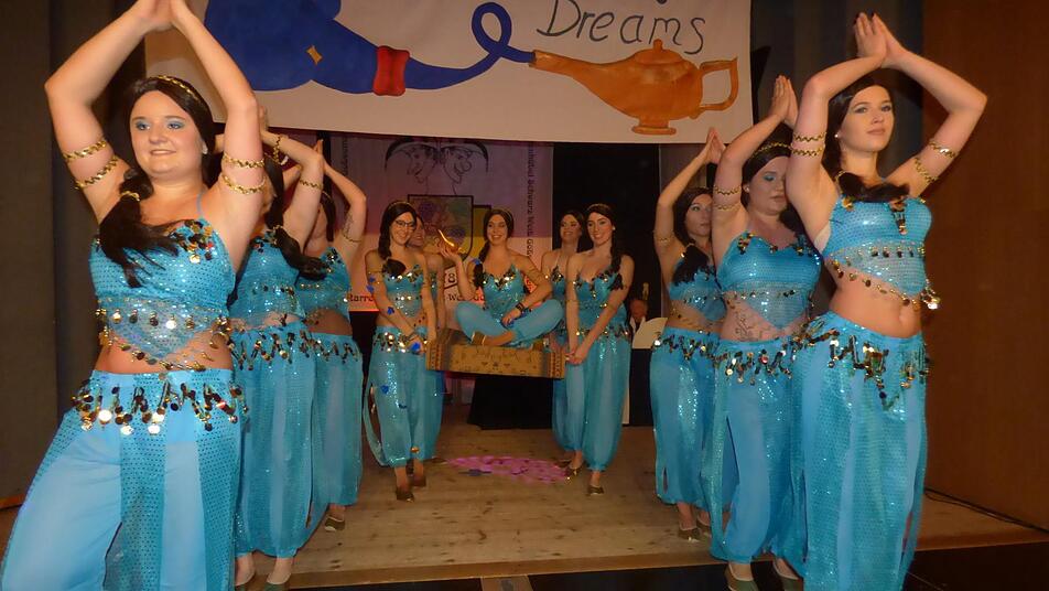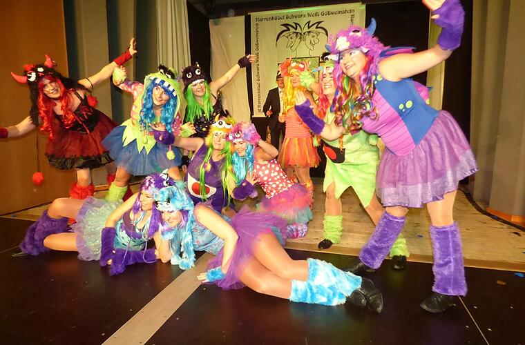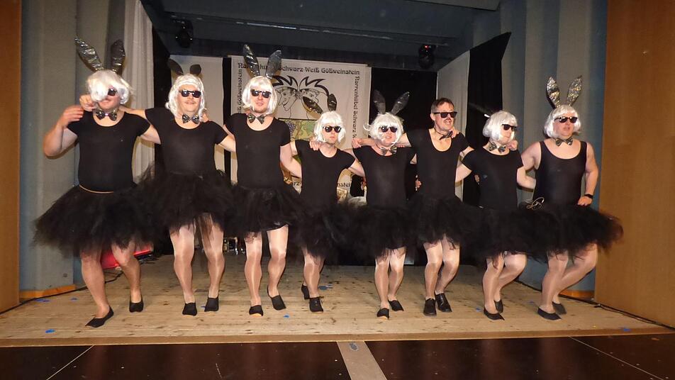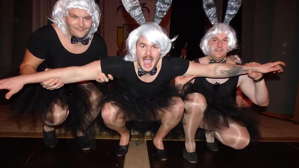Die Prinzen- und Juniorengarde außerdem noch jeweils einen Schautanz. Ins Reich aus Tausend und einer Nacht entführten die Damen der Schautanzgruppe mit ihrem gekonnt dargebotenem Tanz "Arabia Dream". Als fantasievoll gekleidete "Monster" warten heuer die Frauen des Weiberballetts auf und die Narrenkübel-Männer schwebten grazil in schwarzen Spitzenröckchen und riesigen Hasenohren über die Bühne. Urkomisch, wie die vergangenen Jahre auch schon, der Gößweinsteiner Feuerwehrkommandant Marcel Zweck in seinem knallroten Strampelhosenanzug. Für den Sketch "Dinner for one auf Fränkisch" mit seiner Partnerin Miss Sophie (Michael Stenglein) hatte er sich als Butler eigens eine schwarze Fliege umgebunden. Der Brüller war auch der Sketch "Die Baustelle" von und mit Andreas Schmidt in dem es nur darum ging, ein viel zu hoch montiertes "Baustelle-Verboten-Schild" abzumontieren.