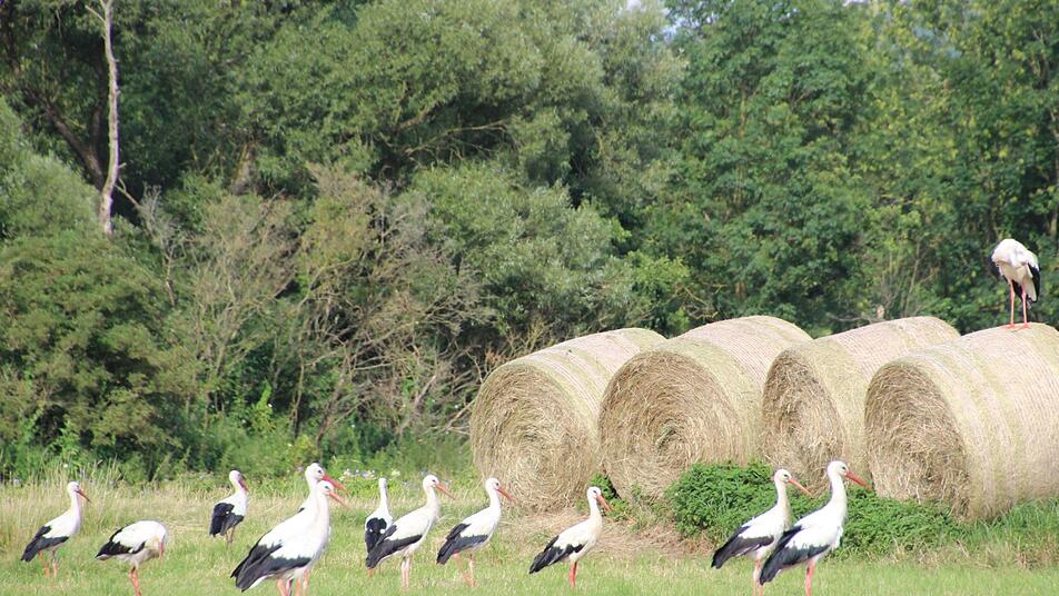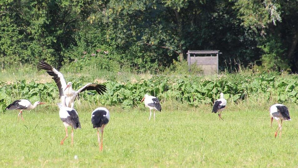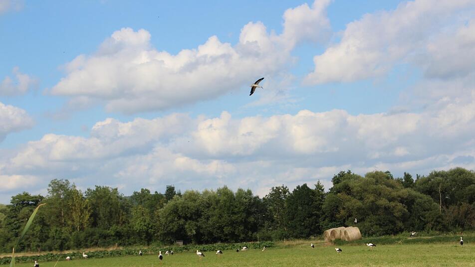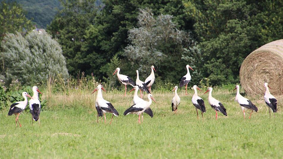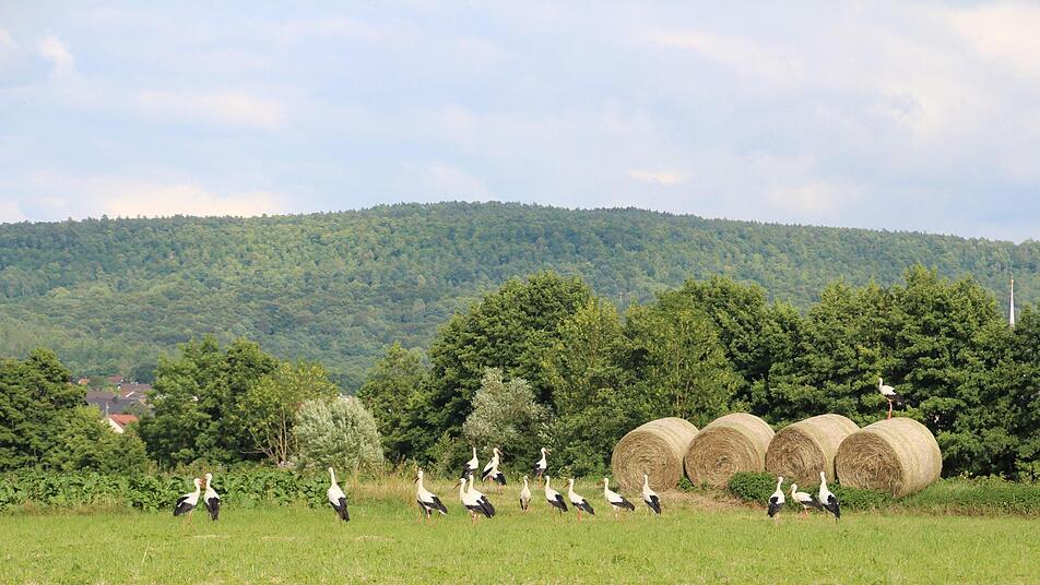 40 Störche auf einem Haufen - das seltene Naturschauspiel bietet sich derzeit auf der Wiese zwischen Weilersbach und Reuth.