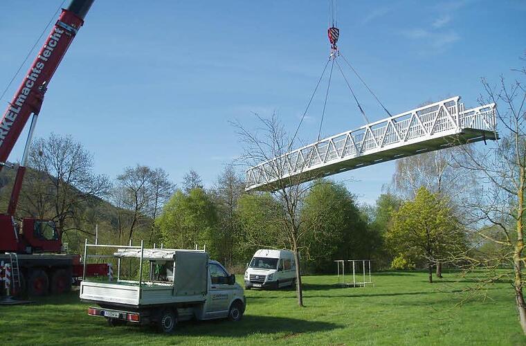 Nun fand sie ihren Bestimmungsort und verbindet das Freibadgelände mit der Liegewiese am anderen Wiesentufer. Bis die Brücke gesetzt werden konnte, waren einige Vorbereitungsmaßnahmen nötig. Bereits im Herbst wurde die alte Holzbrücke aus dem Jahre 1990 abgebaut. Die Witterung hatte dem Holz arg zugesetzt, so dass die Wahl auf eine wetterbeständige Alu-Brücke fiel.