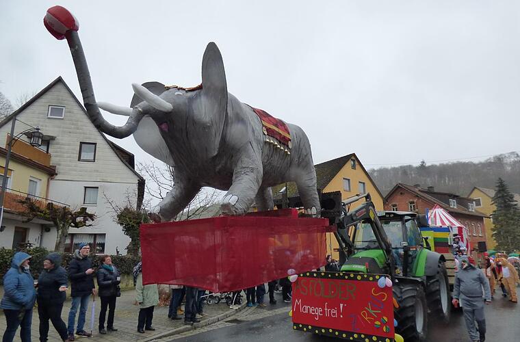 Den imposantesten und aufwendigsten Faschingswagen hatten die "Asfölder" aus dem benachbarten Ober- und Unterailsfeld mit einen kompletten Zirkus gebaut und nach Waischenfeld gesteuert. Vorne ein riesiger Zirkuselefant, hinten ein Zirkuszelt, dahinter eine große Fußgruppe mit Clowns und Zirkustieren.