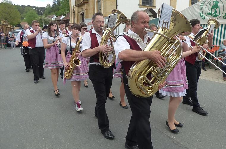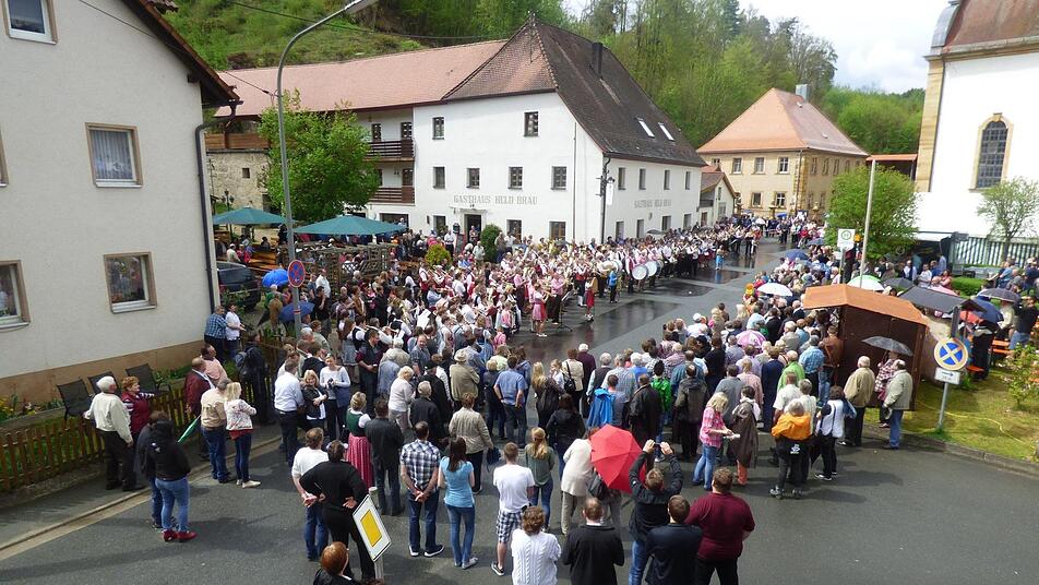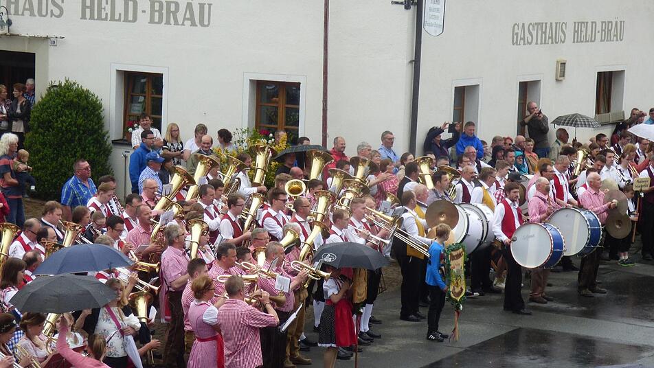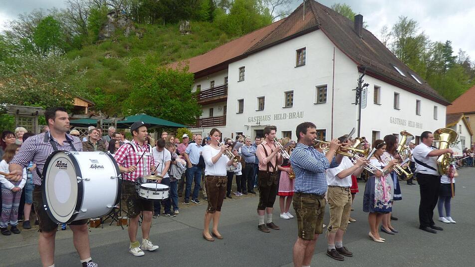 Die Trachtenkapelle aus Hohenmirsberg hatte sich unter dem so genannten "Radlerfelsen", dem Wahrzeichen von Oberailsfeld, postiert - die Blaskapelle Poppendorf auf der schräg gegenüberliegenden "Bauernleite" oberhalb der Pfarrkirche-St.-Burkard. Viel beklatscht durch das Publikum wurde der musikalische Einzug der Blaskapelle "El-Wi-Wa", was für Elbersberg, Willenreuth und Wannberg steht, wie Reinhold Heumann als Moderator, auf einem riesigen Bierfass stehend, inmitten der Menschenmenge aufklärte.