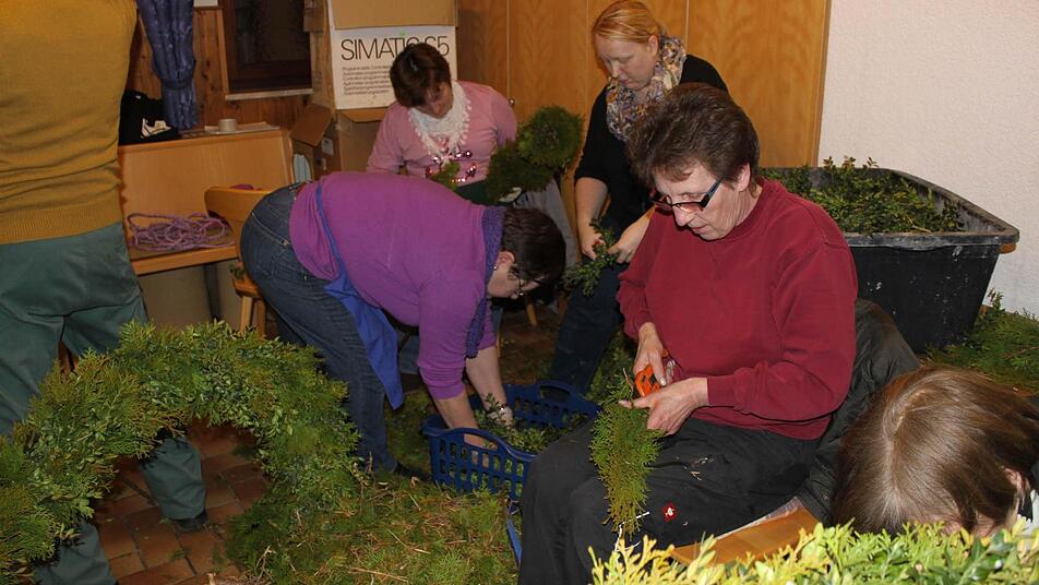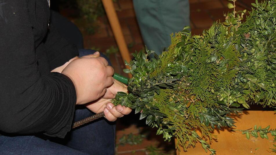 Und Notburga Heilmann ergänzte: "Tradition ist uns wichtig, deshalb sind wir hier und machen die viele Arbeit." Sie wurde unterbrochen von Gerhard Arzt: "Die Krona hängt auf halbä Achta!" Und alle schauten zu, wie Frieda Schmitt die Krone gerade richtete. Denn der Brunnen soll ab Palmsonntag perfekt sein und während der Osterzeit das Dorf schmücken.