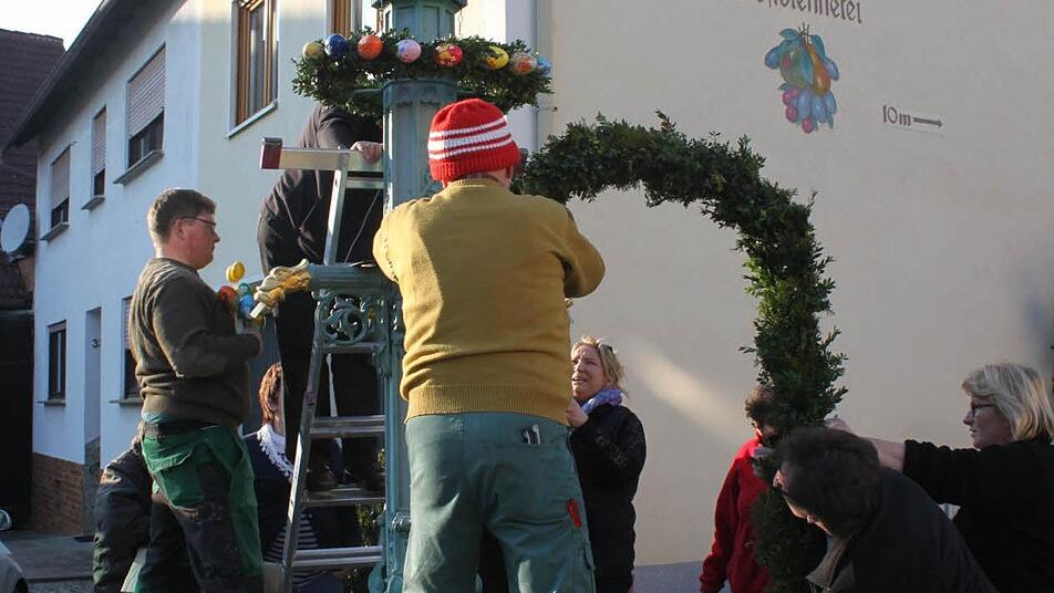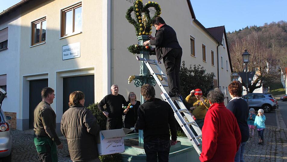 Am Freitagnachmittag wurde dann der Ortsbrunnen geschmückt. "Wenn wir es nicht machen, macht es doch keiner", seufzte Notburga Heilmann und reichte Ostereier an Frieda Schmitt weiter, die auf der Leiter stehend die Krone am Brunnen schmückte.