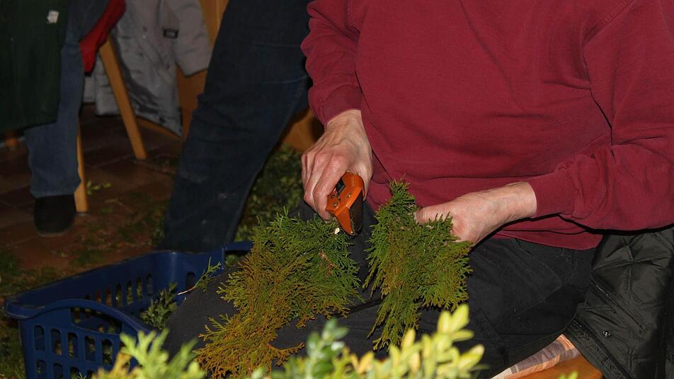 Das hieß für die Männer des Vereins, dass sie vorher in verschiedenen Gärten Hecken schneiden durften. Verwendet wurden Thuja- und Buchszweige. Pünktlich trafen dann Frauen und Männer im Clubheim ein. Die einen schnitten die Zweige, die anderen banden die Bögen, die jungen Männer durften die Eier holen und säubern.