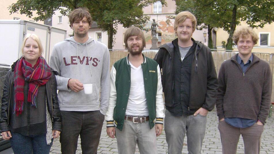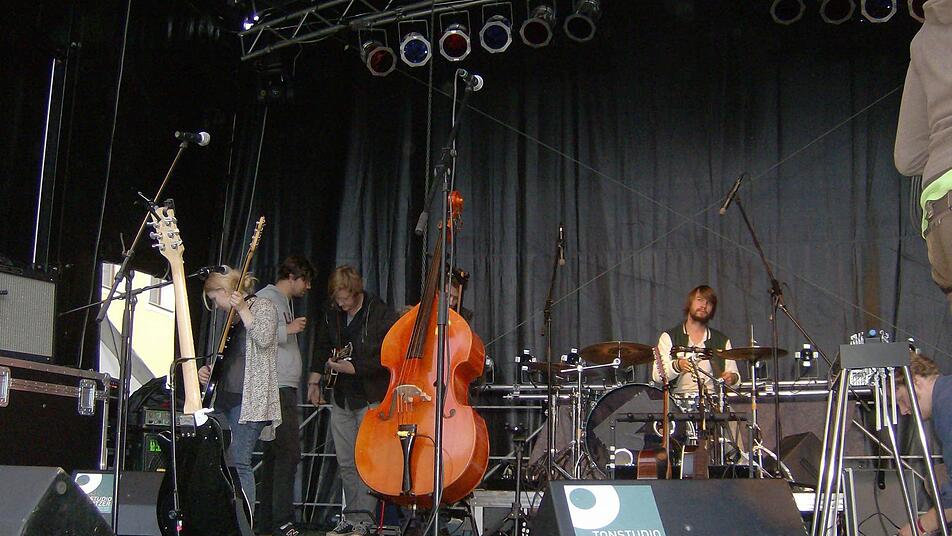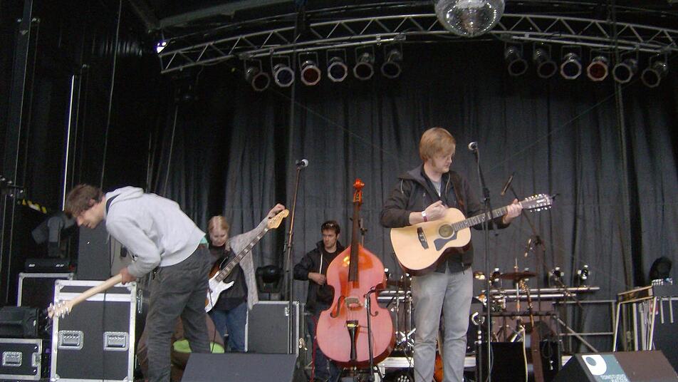 "Wir sind einige Zeit auf der Bundesstraße gefahren, und haben viele Schlösser gesehen", erzählen sie. "Wir wurden gefragt, ob wir hier mitmachen", sagt Melf. Das Open-Mind-Festival gegen Rechts finden sie eine gute Sache, also sagten sie zu und kamen extra aus Hamburg angereist. Die jungen Musiker, Anfang bis Mitte 20, trinken aus, treffen den Rest der Band, um auf der Bühne ihre Instrumente aufzubauen. Melf spielt Gitarre, Felix Schlagzeug, Sönke ist der Sänger und Ove spielt das Harmonium. Zum Einspielen brauchen sie nicht viel Zeit, denn 150 Konzerte im Jahr sind bei ihnen die Regel. Die Musik ist eine Mischung aus Country und Folk.