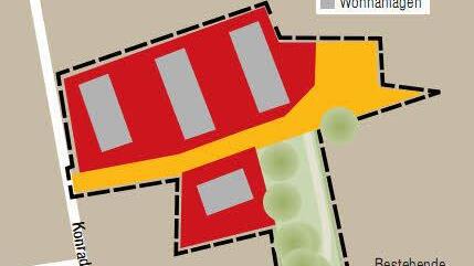 Zum einen wurde der Umfang der Bebauung deutlich reduziert. Die aktuelle Planung sieht 14 Reihenhäuser, aufgeteilt in drei Zeilen vor, die durch eine Stichstraße auf halber Höhe von der Konrad-Roth-Straße aus erschlossen werden. "Die Tatsache, dass die Häuser Tiefgaragen haben, hat uns sehr gefallen" , erklärt Zedler. Wichtig sei auch gewesen, dass das östliche Nachbargrundstück, die Wiese gegenüber dem Rewe-Einkaufsmarkt ebenfalls über dieses Straße erschlossen werden kann. Zudem genießen die weit über hundert Jahre alten Platanen, Schwarzkiefern und Eichen auf dem Gelände nun Bestandsschutz. Die Bäume sind mit roten Punkten gekennzeichnet und müssen erhalten werden.