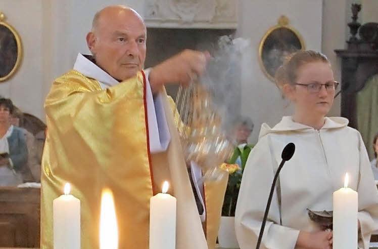 Im Namen der Kirchenstiftung Gößweinstein übergab sie eine kleine Aufmerksamkeit zur persönlichen Verwendung an den Jubelpriester. In seiner Begrüßung ging Pfarrer Pater Flavian Michali auf die Berufung von Pater Raymund zum Priester und Franziskaner ein. Gott habe ihn diese Berufung spüren lassen. Dafür gelte es Gott in dieser Messfeier zu danken. Ein Dank und Hochachtung gebühre aber auch den Eltern. Durch die doppelte Berufung zum Priester und Franziskaner habe die Familie auf Raymund Eglmaier verzichten müssen.