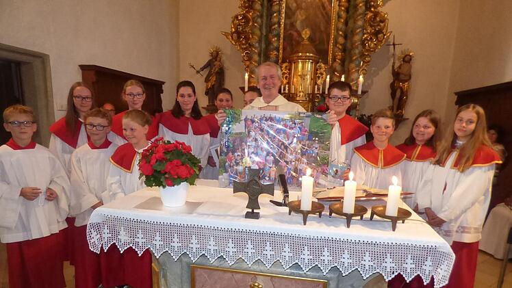 Bei der Abschiedsfeier im Pfarrgarten spielte die Blaskapelle Hochstahl zünftig auf. Pfarrer Stiefler freute sich insbesondere über seine Ministranten, die ihm ein großes Bild schenkten, und über das Abschiedsgeschenk der Pfarrei in Form eines Gemäldes, das alle Kirchen und Kapellen der Pfarrei zeigt. "Ihren liebevollen Kosenamen "Die Moggerla" werden wir nie vergessen", sagte die Sprecherin der Ministranten und erinnerte an Spaß, Freude und Abenteuer, die sie mit ihrem Pfarrer erlebt hatten.